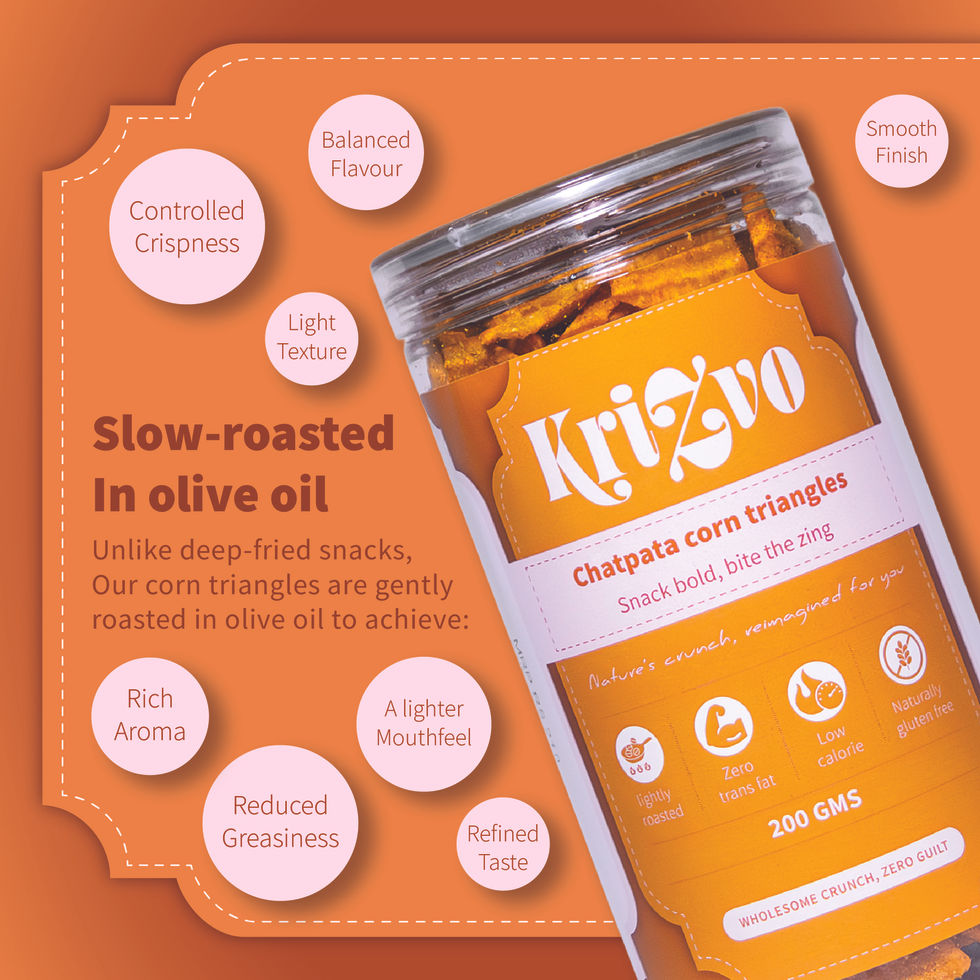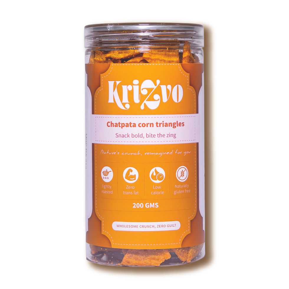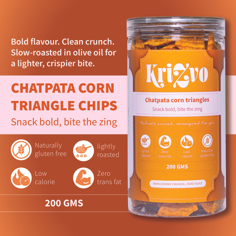 Chatpata Corn Triangle Chips are slow-roasted in olive oil to deliver the perfect balance of crunch and flavour. Made using carefully selected corn and a bold, tangy spice blend, these chips are light on the palate yet packed with taste. With no preservatives and no added colours, every bite is clean, wholesome, and satisfying.